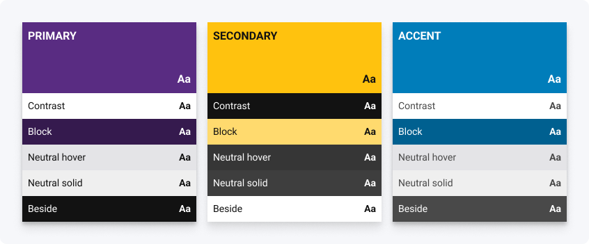 Dynamic colours change per brand and communicate a brands visual identity. Their accessibility with black or white can vary per brand. For example, the primary colour may be dark purple in one brand (accessible with white), and yellow in another brand (accessible with black).